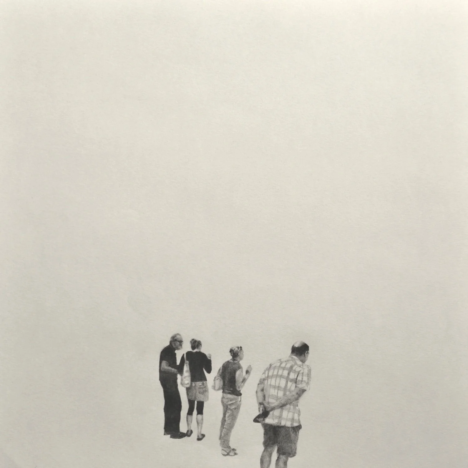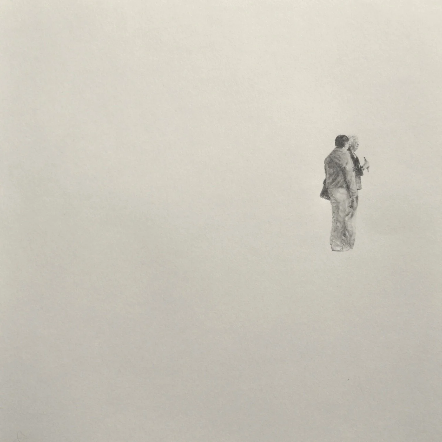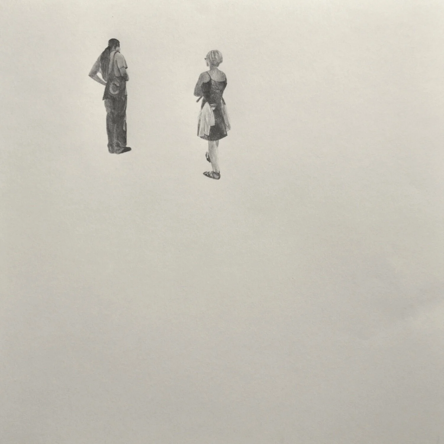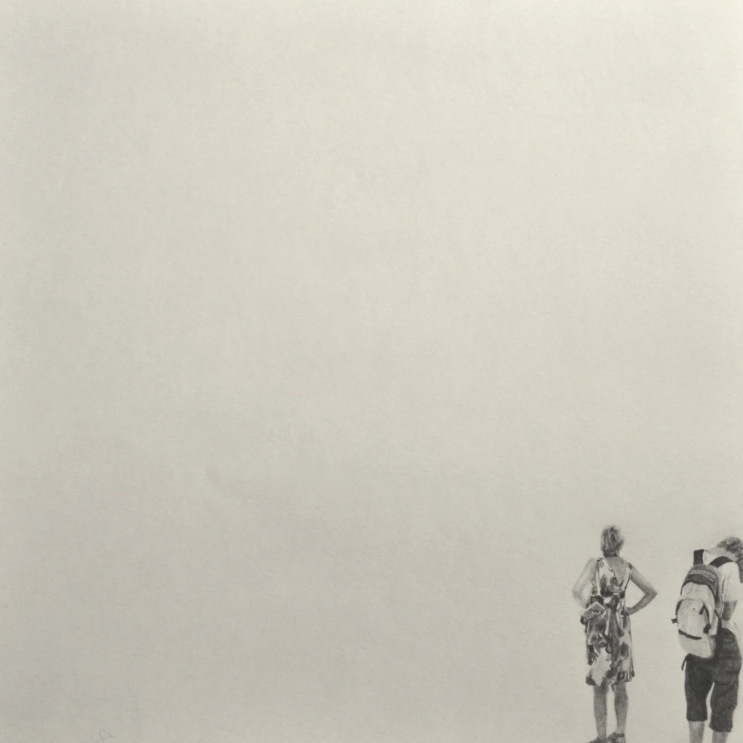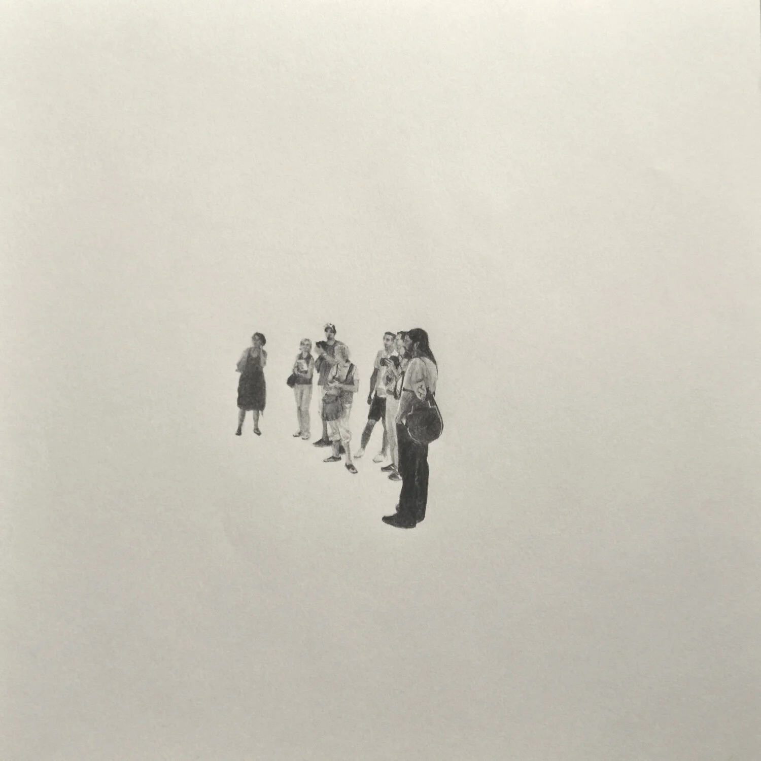 Only viewers are depicted within a blank page space – an approach motivated by a recurring interest in the spatial relationship between marked and unmarked areas in painting and drawing. In making this series I was curious about the extent to which the unmarked pictorial space inherits a scale, shape or ambience from the drawn elements.